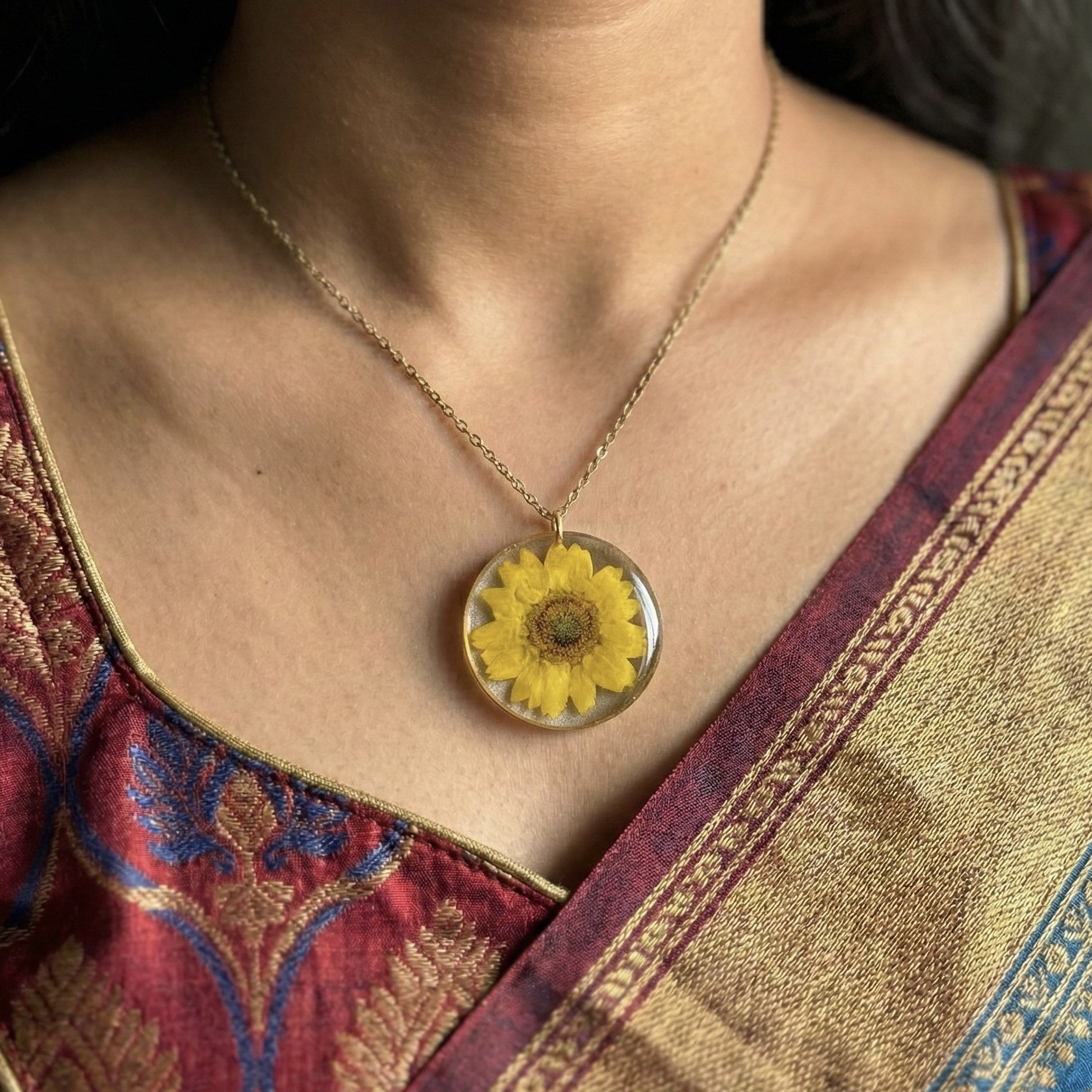 Real Yellow Daisy Necklace Handmade Resin Pendant | Anti-Tarnish Chain